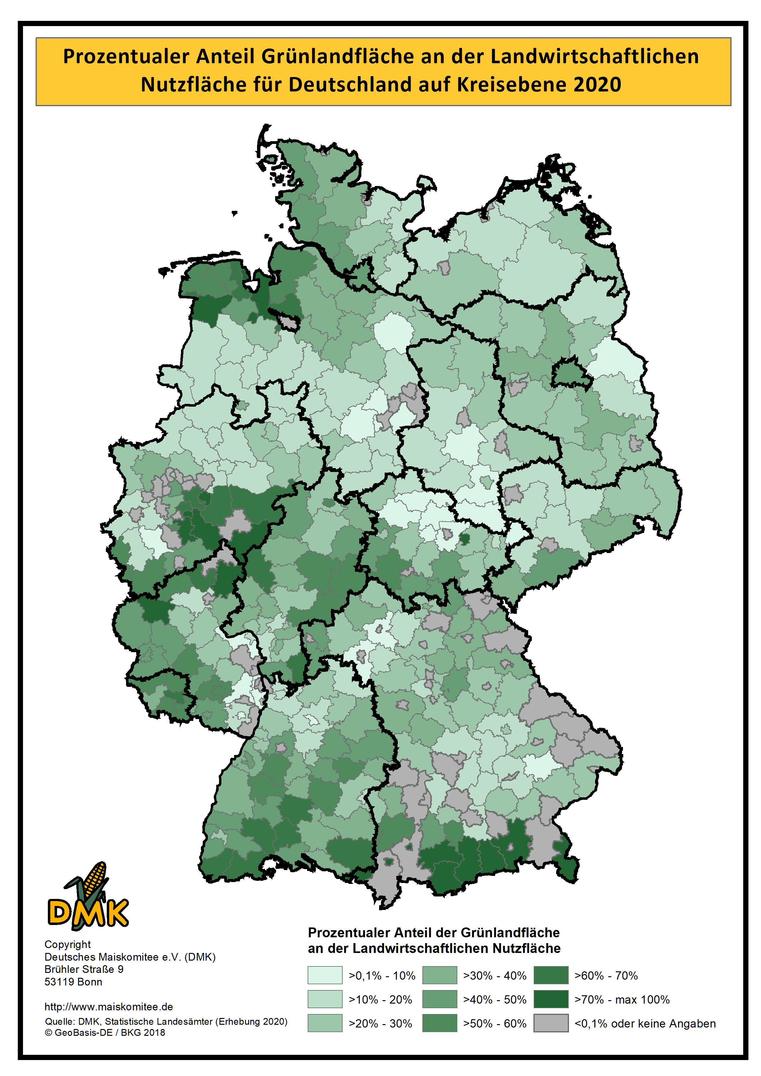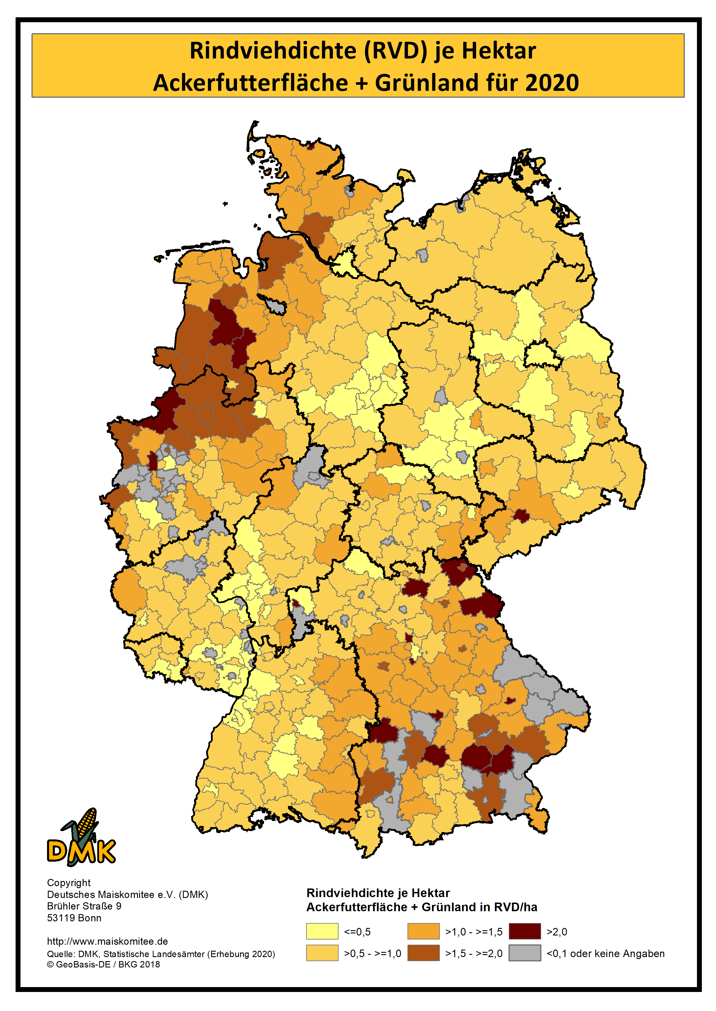 Auf dieser Seite haben wir die statistischen Daten zum Maisanbau, auf Kreisebene, in Karten projiziert. Die Daten basieren auf der Landwirtschaftszählung, die 2020 durch die Statistischen Ämter des Bundes und der Länder durchgeführt wurde. Die nächste Landwirtschaftszählung wird voraussichtlich 2030 erfolgen.